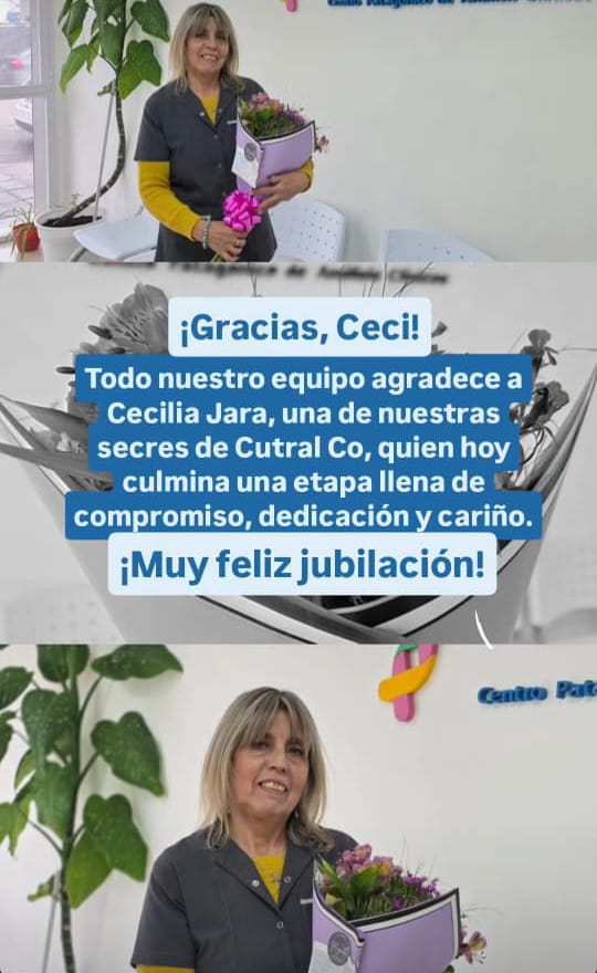 “¡Gracias, Ceci!. Todo nuestro equipo agradece a Cecilia Jara, una de nuestras secres de Cutral Co, quien hoy culmina una etapa llena de compromiso, dedicación y cariño”.
