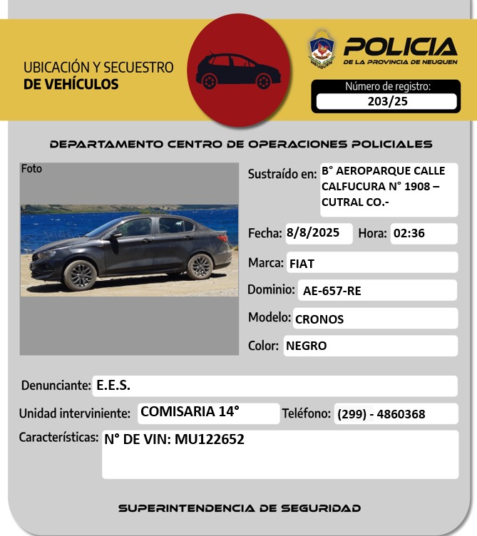 Robaron un vehículo Cronos y lo buscan en Cutral Co