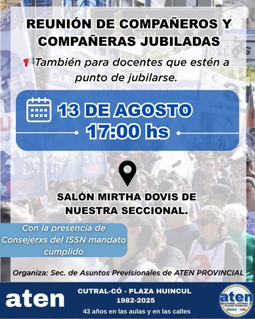 La Secretaría de Asuntos Previsionales de ATEN Provincial convoca a una reunión especial dirigida a compañeras y compañeros docentes jubilados, así como a aquellos que estén próximos a jubilarse. El encuentro se realizará el próximo 13 de agosto a las 17:00 horas en el Salón Mirtha Dovis de la seccional local.