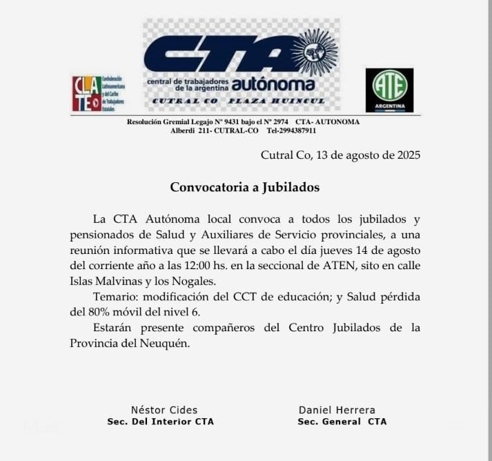 Desde la CTA Autónoma de Cutral Co se llamó a los jubilados y pensionados que se desempeñaron en el sector de Salud y como auxiliares de servicio, a una reunión informativa.
