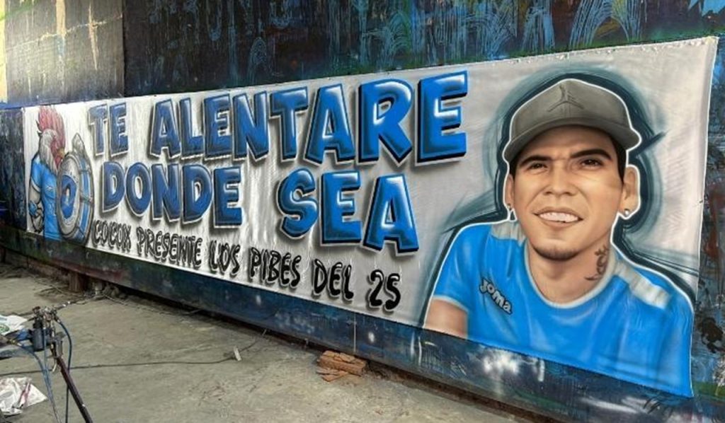 Los Pibes del 25 hicieron una bandera con la frase “Te alentaré donde sea” y un retrato de Cocox en una de sus esquinas.