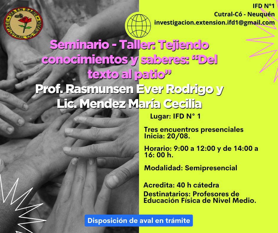 El Instituto de Formación Docente N°1, de Cutral Co, anunció la apertura de inscripciones para el Seminario-Taller de Extensión “Tejiendo conocimientos y saberes: Del texto al patio”, que será dictado por el profesor Rasmunsen Ever Rodrigo y la licenciada Méndez María Cecilia.