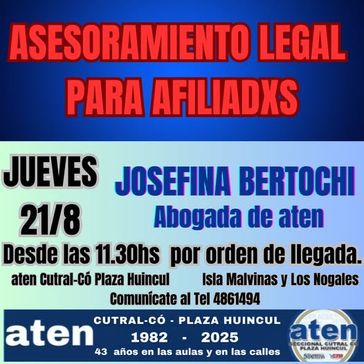 La seccional ATEN Cutral Co y Plaza Huincul anunció que este jueves 21 de agosto, la abogada Josefina Bertochi brindará asesoramiento legal a los afiliados de la organización.