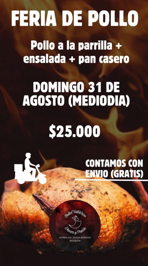 El Ballet Folklórico Danza y Pasión realizará una venta de pollos con ensalada y pan casero para el mediodía del domingo 31 de agosto, con el objetivo de poder recaudar fondos para concretar el viaje a la provincia de Buenos Aires.