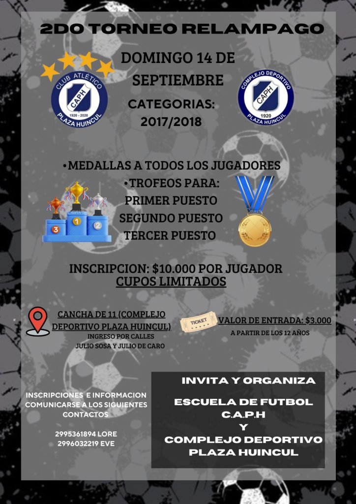 El próximo domingo 14 de septiembre el Club Atlético Plaza Huincul organiza el segundo torneo relámpago para las categorías 2017/18.