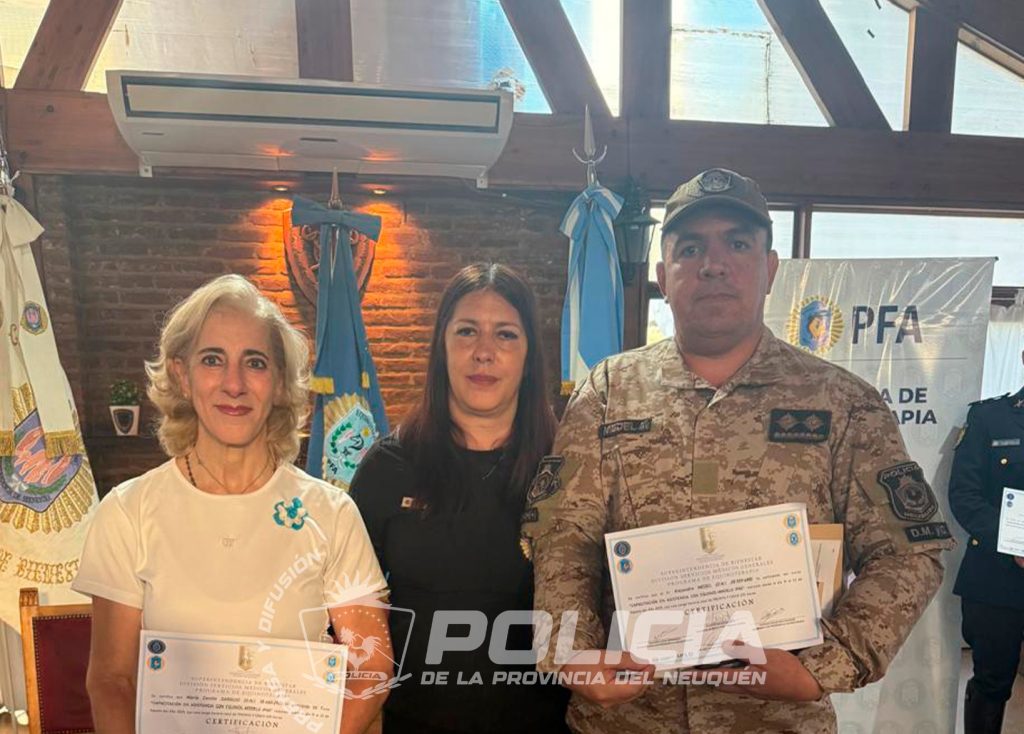 La capacitación estuvo a cargo del Comisario Alejandro Medel, jefe de la División Montada y Canes, junto con la Licenciada en Kinesiología y Comisario Cecilia Sarquis, de la Policía del Neuquén. Ambos profesionales cumplieron con las exigencias académicas y recibieron la certificación correspondiente.