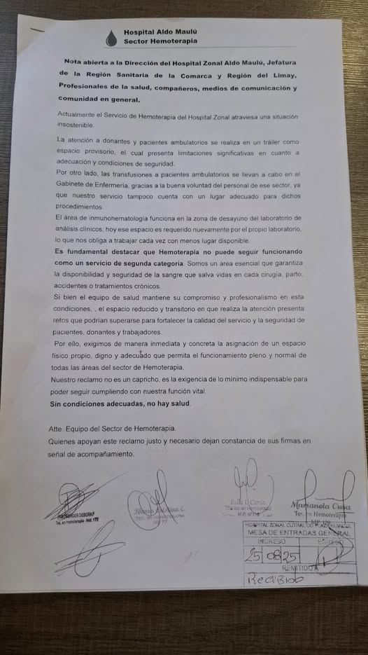 El servicio de Hemoterapia del hospital Zonal de Cutral Co y Plaza Huincul atraviesa una situación considerada insostenible por su propio personal. Según un comunicado del equipo del área, la atención a donantes y pacientes ambulatorios se realiza en un tráiler provisorio, con limitaciones en seguridad y condiciones de trabajo.