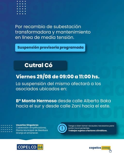 Copelco) informó que este viernes 29 de agosto, entre las 09:00 y las 11:00 horas, se realizará una suspensión provisoria del suministro eléctrico en sectores de Cutral Co.