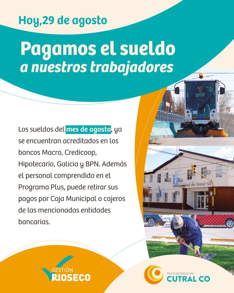 El municipio de Cutral Co informó que los sueldos correspondientes al mes de agosto ya están disponibles para su retiro. Las personas que forman parte del programa Plus, pueden acceder a sus pagos hoy mismo.