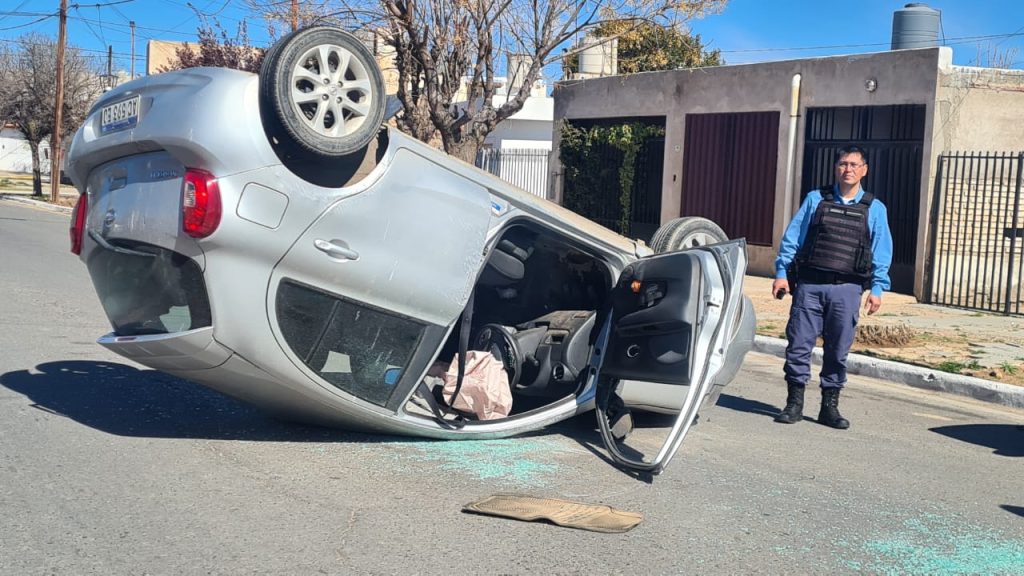 Un automóvil Nissan March, que circulaba por calle Alem en sentido norte-sur, impactó contra un Toyota Etios que se encontraba estacionado. A raíz del choque, el Nissan March volcó. El conductor, un adulto mayor, fue trasladado por la ambulancia hacia un centro de salud para su atención.
