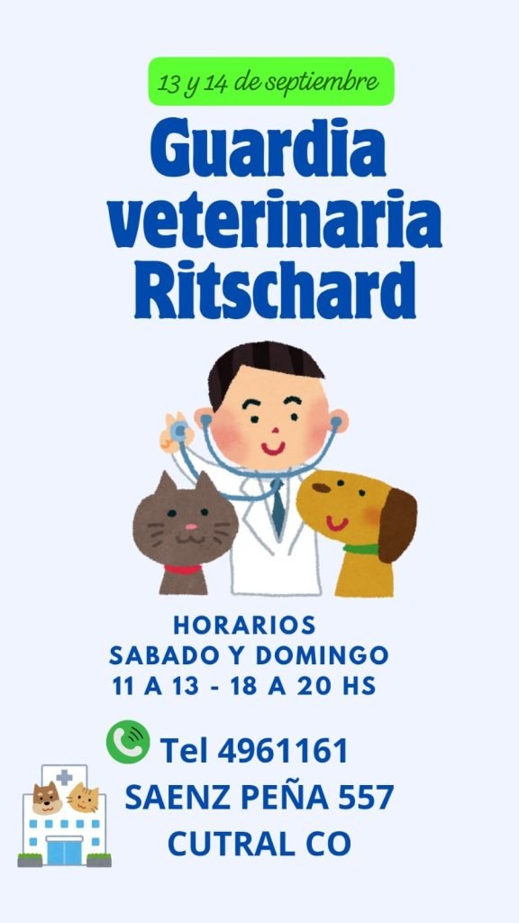 Este domingo, la veterinaria que le corresponde la guardia es Ritschard. Su atención será de 11 a 13 y por la tarde, abrirá de 18 a 20.