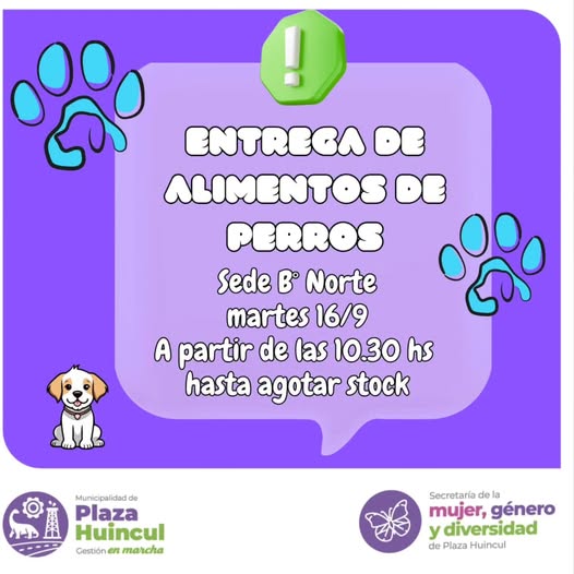 La secretaría de la Mujer, Género y Diversidad de la Municipalidad de Plaza Huincul anunció que este martes 16 de septiembre se llevará a cabo una nueva entrega gratuita de alimento para perros, destinada a vecinos y vecinas de la ciudad.