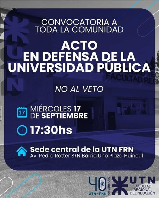 La Facultad Regional Neuquén de la Universidad Tecnológica Nacional (UTN FRN) invita a toda la comunidad a participar de un acto en defensa de la universidad pública, que se llevará a cabo este miércoles 17 de septiembre a las 17:30 horas en la sede central de la institución, ubicada en Av. Pedro Rotter S/N, Barrio Uno, Plaza Huincul.