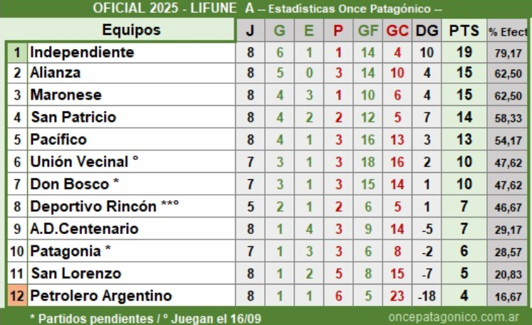 En la A, lidera Independiente con 19 puntos, seguido por Alianza y Maronese con 15 puntos, San Patricio tiene 14 puntos, Pacífico 13, Unión Vecinal y Don Bosco tiene 10 puntos pero ambos deben un partido frente a Rincón que tiene 7 puntos con 3 partidos menos, Centenario tiene 7 puntos, Patagonia tiene 6 puntos, San Lorenzo tiene 5 y cierra la tabla Petrolero Argentino tiene 4 puntos.
