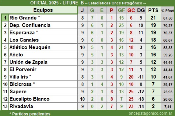 En la B lidera Río Grande con 21 puntos y un partido menos, seguido por Confluencia y Esperanza (con un partido menos) con 19 puntos. Los Canales tiene 18 puntos, Atlético Neuquén y Añelo tiene 16 puntos, con 12 unidades estan Unión de Zapala y El Porvenir, Villa Iris tiene 10 puntos y un partido menos, Bicicross (adeuda un partido) y Sapere tiene 7 unidades, Eucalipto Blanco tiene 6 puntos y Rivadavia tiene 2 unidades.