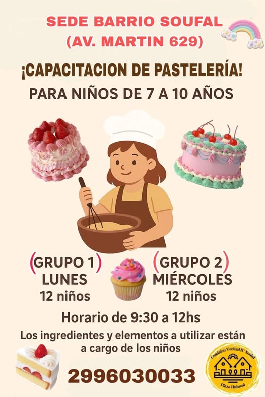 En la sede del barrio Soufal, ubicada en avenida San Martín 629 de Plaza Huincul, se pondrá en marcha una capacitación de pastelería destinada a niñas y niños de entre 7 y 10 años.
