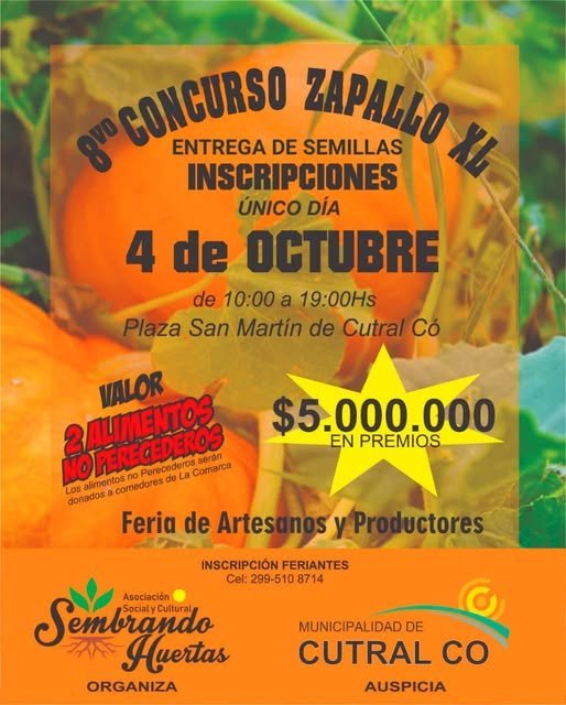 Cutral Co, junto a la Asociación Social y Cultural Sembrando Huertas, anunció la realización del 8° Concurso Zapallo XL, un evento que convoca a vecinos y productores de la región a participar con sus cultivos más destacados.