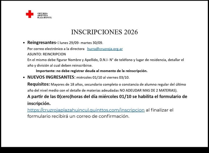 Por su parte, los nuevos ingresantes podrán inscribirse del miércoles 1 al viernes 3 de octubre. Los interesados deben ser mayores de 18 años y contar con secundario completo o constancia de alumno regular del último año, sin adeudar más de dos materias. El formulario estará disponible desde las 0:00 horas del 1 de octubre a través del portal: https://cruzrojaplazahuincul.quinttos.com/inscripcion. Al completar la inscripción, los postulantes recibirán un correo de confirmación.
