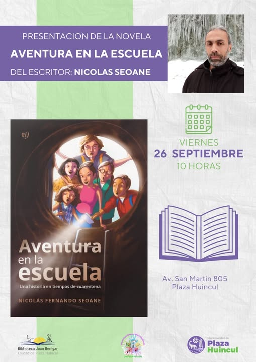 Plaza Huincul se prepara para recibir este viernes 26 de septiembre al docente y escritor local Nicolás Seoane, quien presentará su más reciente novela, “Aventura en la Escuela”. La actividad se llevará a cabo en la biblioteca Municipal Juan Benigar, a partir de las 10:00 horas.