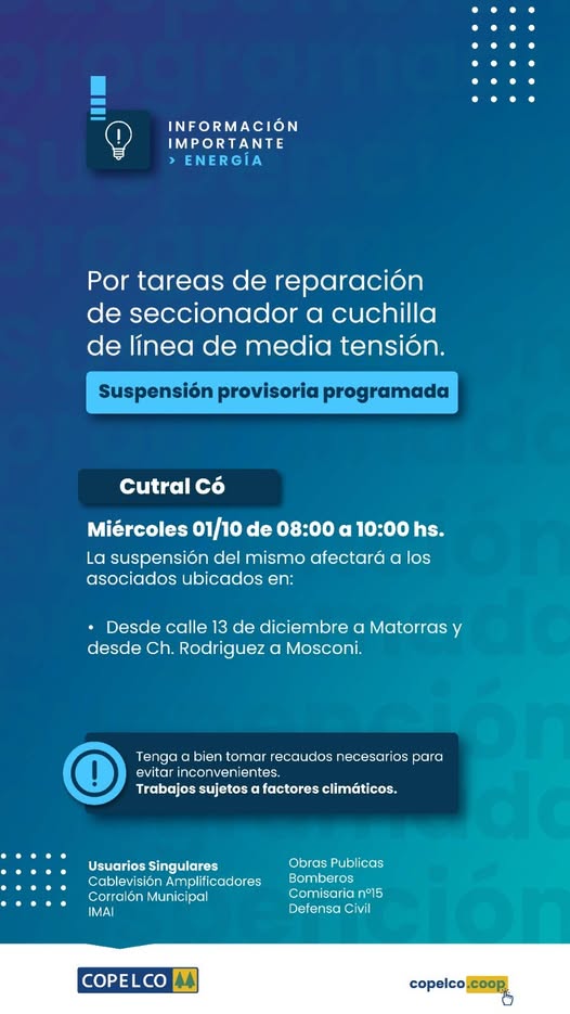 Copelco se informó a los vecinos que, debido a tareas de reparación de un seccionador a cuchilla en la línea de media tensión, se realizará una suspensión temporal del suministro eléctrico el próximo miércoles 1 de octubre, entre las 08:00 y las 10:00 horas.