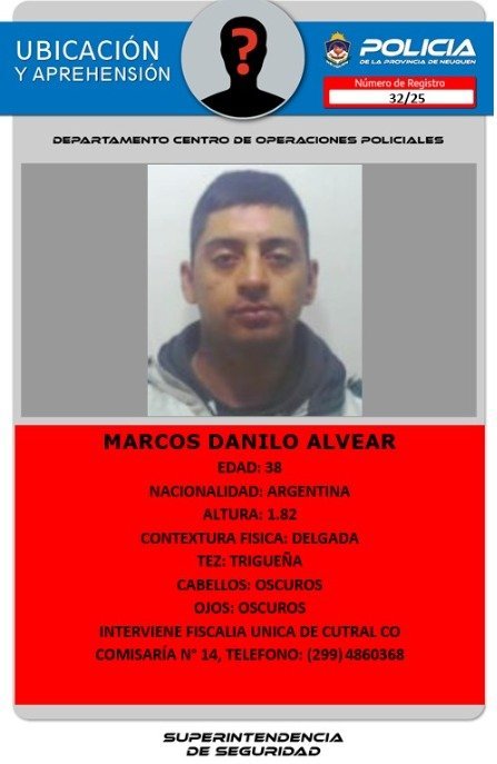 El departamento Centro de Operaciones Policiales se informó que Alvear, tiene 38 años; y mide 1,82 metros.