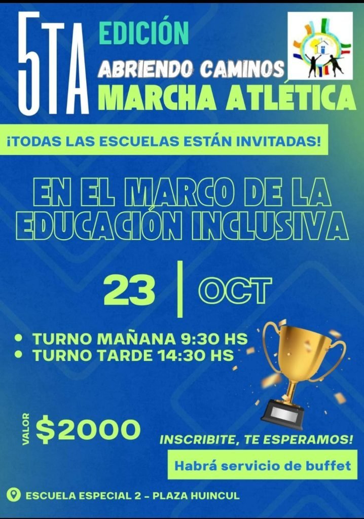 La escuela especial N°2 de Plaza Huincul se prepara para recibir el próximo 23 de octubre a la comunidad a la 5° edición de la Marcha Atlética “Abriendo Caminos”, un evento que se realiza en el marco de la educación inclusiva. La actividad busca fomentar la participación, la integración y la práctica deportiva entre los alumnos de distintas escuelas.