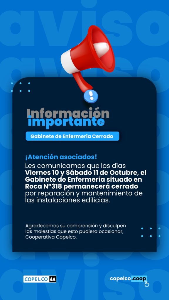 Desde la cooperativa Copelco se informó que este viernes 10 y sábado 11 de octubre el gabinete de enfermería estará cerrado.