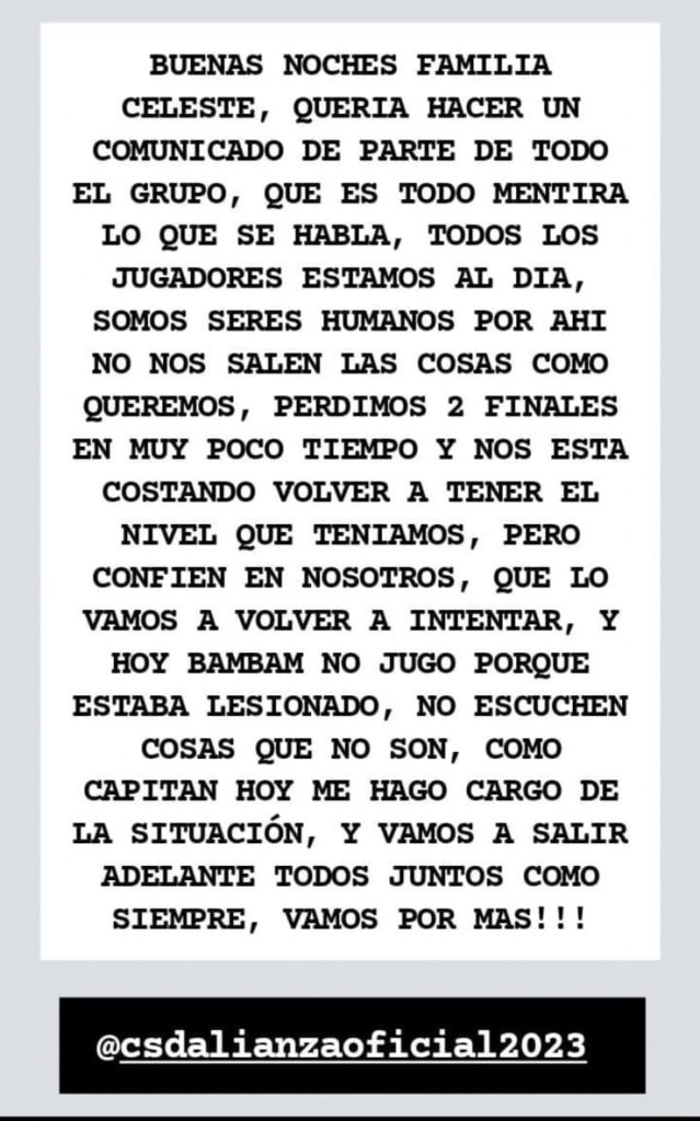Según explicó, todo el grupo de jugadores querían informar que están al día con sus pagos. Y que en lo futbolístico “por ahí no nos salen las cosas como queremos, perdimos dos finales en poco tiempo y nos está costando volver a tener el nivel que teníamos”, expresó el arquero y capital del club Alianza.
