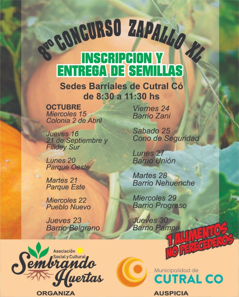 Cutral Co, junto a la Asociación Social y Cultural Sembrando Huertas, inició la inscripción para participar del tradicional Concurso Zapallo XL, una propuesta que busca promover la producción hortícola familiar y el trabajo comunitario.