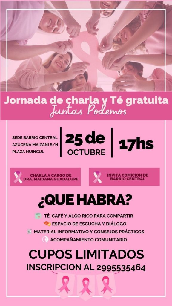 El próximo sábado 25 de octubre a las 17 horas, se llevará a cabo la Jornada de Charla y Té gratuita “Juntas Podemos” en la sede del barrio Central, ubicada en Azucena Maizani s/n de Plaza Huincul.