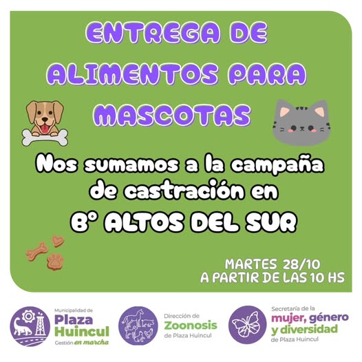 Plaza Huincul, a través de la dirección de Zoonosis, informó que este martes 28 de octubre, a partir de las 10:00 horas, se realizará una entrega de alimentos para mascotas en el marco de la campaña de castración que se desarrollará en el barrio Altos del Sur.