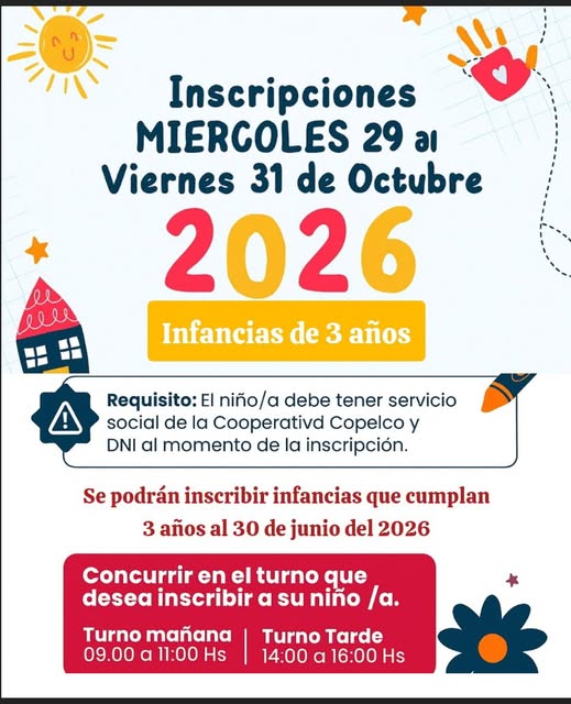 Según informaron desde la institución, la inscripción general comenzó ayer 27 de octubre, y será requisito que el niño o niña cuente con el servicio social de la Cooperativa Copelco. Además, las familias deberán presentar el DNI al momento del trámite.