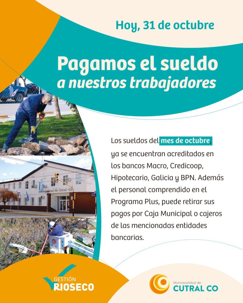 Las y los agentes municipales de Cutral Co percibirán este viernes 31 de octubre sus sueldos correspondientes a este mes. Así lo informó el municipio.