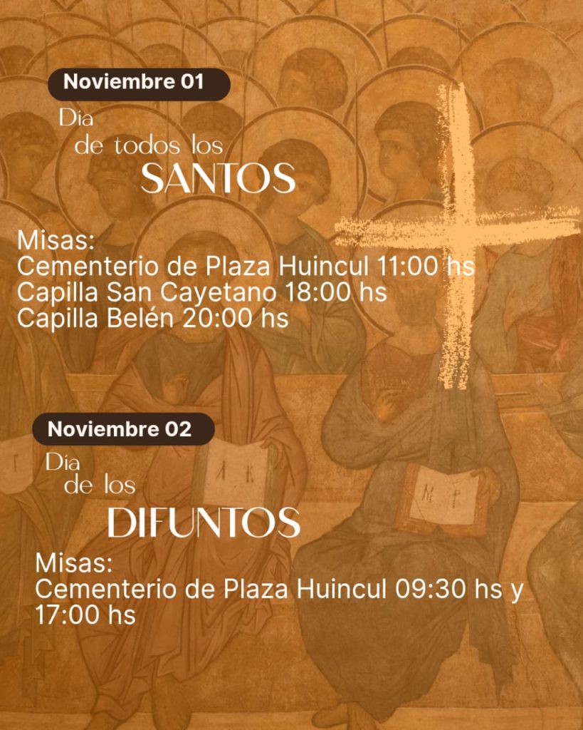 Las comunidades religiosas indicaron que a las 11 habrá misa en el cementerio de Plaza Huincul; a las 18 en la capita San Cayetano situada en el barrio 25 de Mayo de Plaza Huincul. A las 20 será en la capilla de Belén, del barrio Centenario.