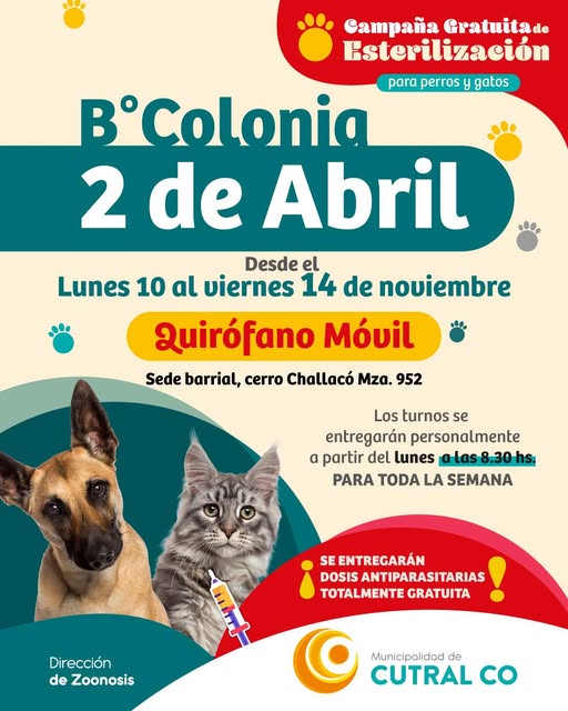Esta semana, el quirófano móvil se trasladará hasta Colonia 2 de Abril de Cutral Co. Se otorgarán los turnos, a partir de las 8:30 de hoy para toda la semana.