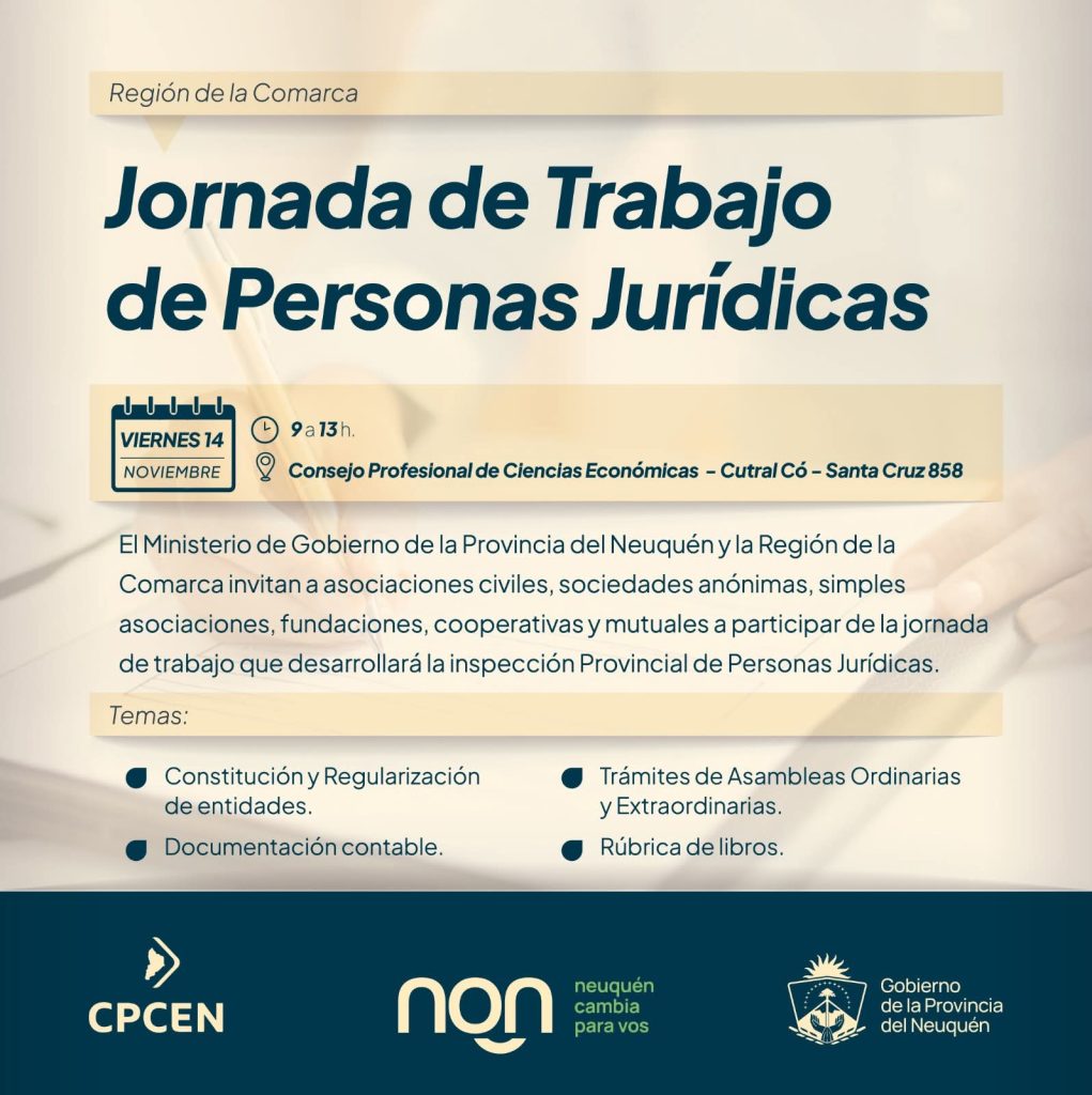 Habrá una jornada de asesoramiento gratuito para las asociaciones civiles de Cutral Co a través de Personería Jurídica.