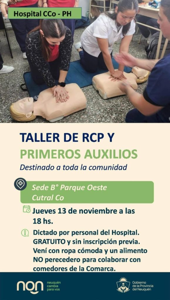 En la jornada de hoy se llevará a cabo un taller en RCP y Primero Auxilios en la sede del barrio Parque Oeste de la ciudad de Cutral Co.