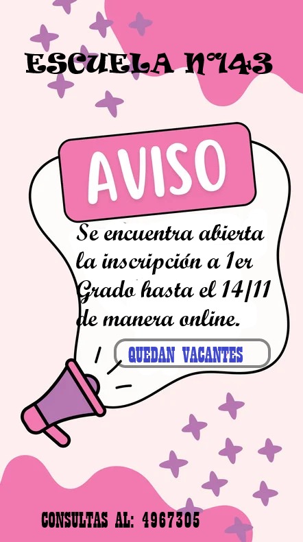 Desde la escuela primaria N° 143 de Cutral Co se informó que todavía hay tiempo para que las familias que tengas niñas o niños para ingresar a 1° grado, los anoten.