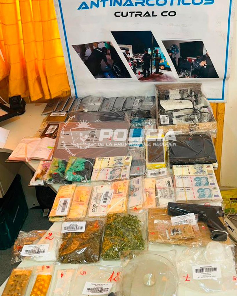 Desde la división Antinarcóticos de Cutral Co se informó que se secuestraron diversas cantidades de clorhidrato de cocaína y cannabis sativa, réplicas de armas de fuego, municiones, dinero en efectivo —presuntamente vinculado a la actividad ilícita—, sistemas de videovigilancia, teléfonos celulares y un automóvil relacionado a los movimientos investigados.