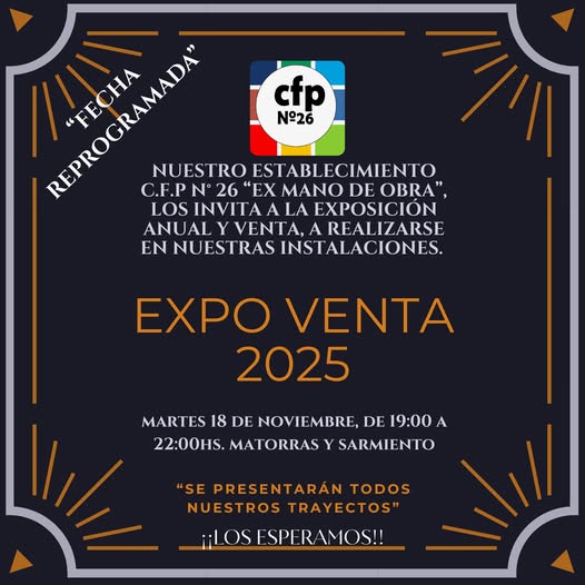 El Centro de Formación Profesional Nº 26 “Ex Mano de Obra” realizará este martes 18 de noviembre, de 19 a 22 horas, su tradicional Expo-Venta anual, una jornada en la que estudiantes y docentes expondrán los trabajos desarrollados a lo largo del ciclo lectivo.