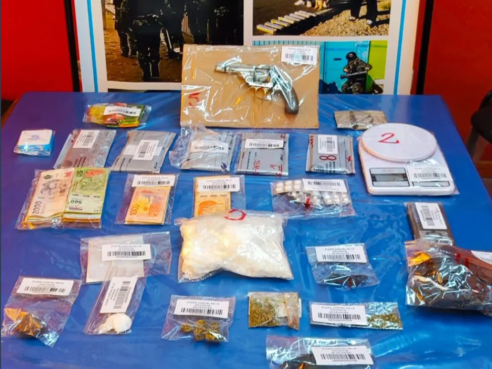 Durante las diligencias se incautaron 259 gramos de cocaína, divididos en 518 dosis, con un valor estimado superior a los $11 millones. También se secuestraron 14 dosis de marihuana, 41 cápsulas utilizadas para estirar sustancias, $185.500 en efectivo, varios teléfonos celulares, un revólver calibre 32 y dos vehículos vinculados a la actividad ilícita.