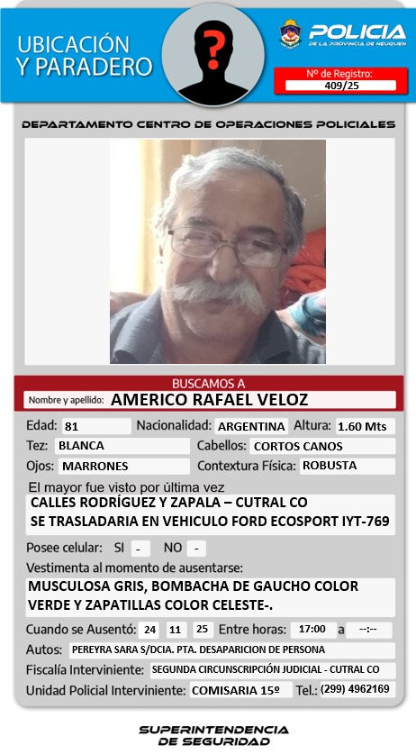Se indicó que el vecino fue visto por última vez en Carlos H. Rodríguez y Zapala de Cutral Co. Se indicó que podría trasladarse en un vehículo Ford EcoSport de patente IYT 769.