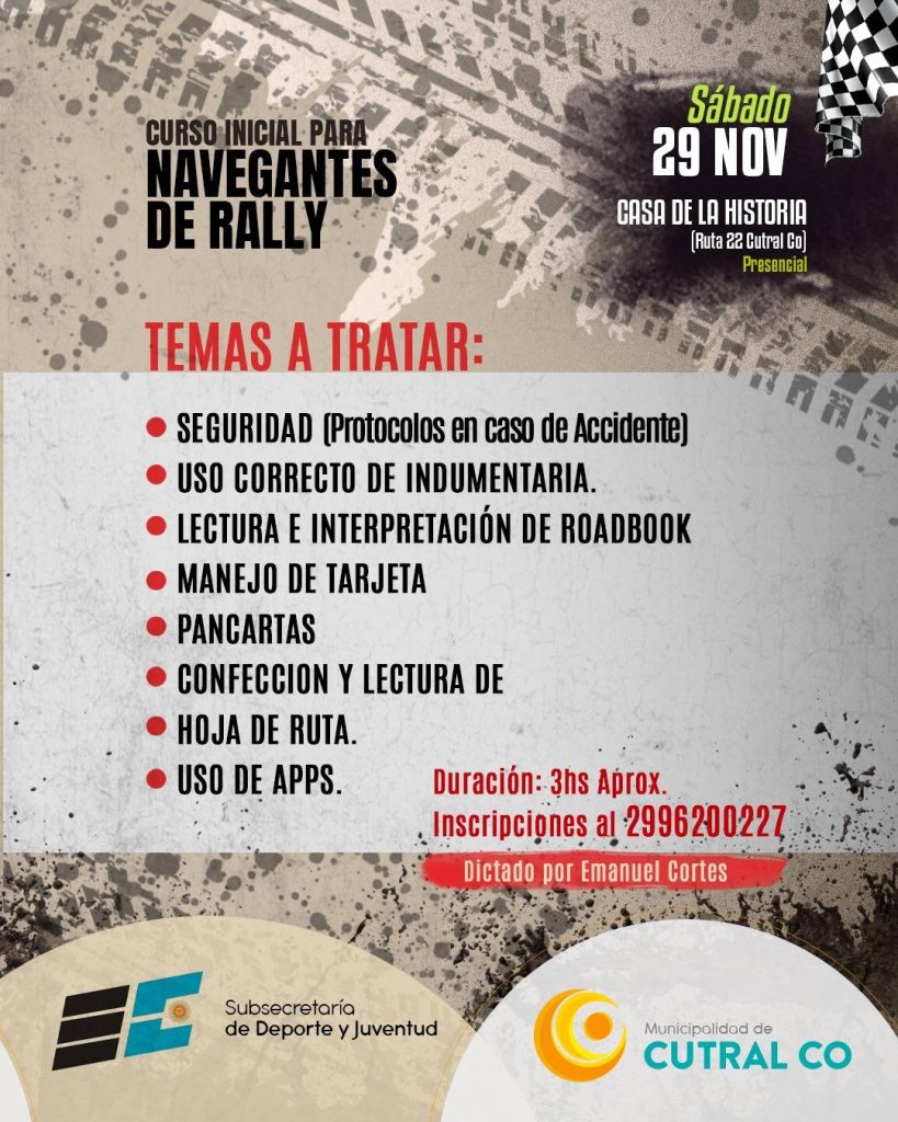 El curso estará a cargo de Emanuel “Ema” Cortés, navegante de trayectoria internacional, y se concretará por la iniciativa del presidente del Concejo Deliberante de Cutral Co, Jesús San Martín, quien impulsó que la capacitación sea abierta y sin costo para los vecinos. Desde la organización señalaron que los cupos son limitados y recomendaron inscribirse con anticipación.