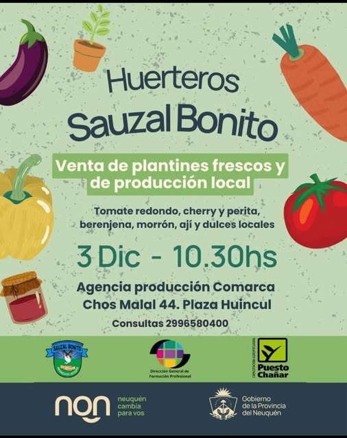 Este miércoles 3 de diciembre, a partir de las 10:30, los huerteros de Sauzal Bonito ofrecerán plantines frescos y de producción local en la Agencia de Producción de la Comarca, ubicada en Chos Malal 44 de Plaza Huincul.