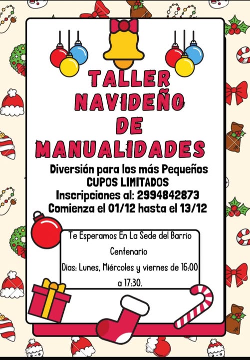 La sede del barrio Centenario anunció la apertura de inscripciones para el taller navideño de manualidades, una propuesta destinada a que los niños y niñas disfruten de actividades recreativas en el marco de las celebraciones de fin de año.