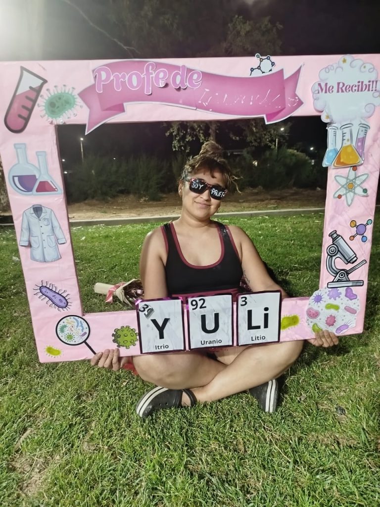 “Queremos saludar a nuestra egresada, ECHEVERRÍA YULIANA que en el día de ayer se recibió DE PROFESORA DE QUíMICA. Estamos orgullosos de ella, de su fortaleza y sus ganas de seguir brillando.Te amamos Yuli. Tus hijos, y familia ❤️”