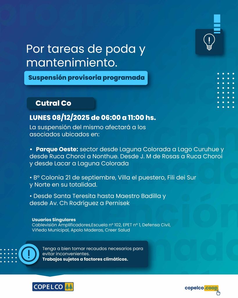 Copelco informó que el próximo lunes 8 de diciembre de 2025, entre las 06:00 y las 11:00, se realizará una suspensión provisoria del servicio debido a trabajos programados de poda y mantenimiento en distintos sectores de Cutral Co.