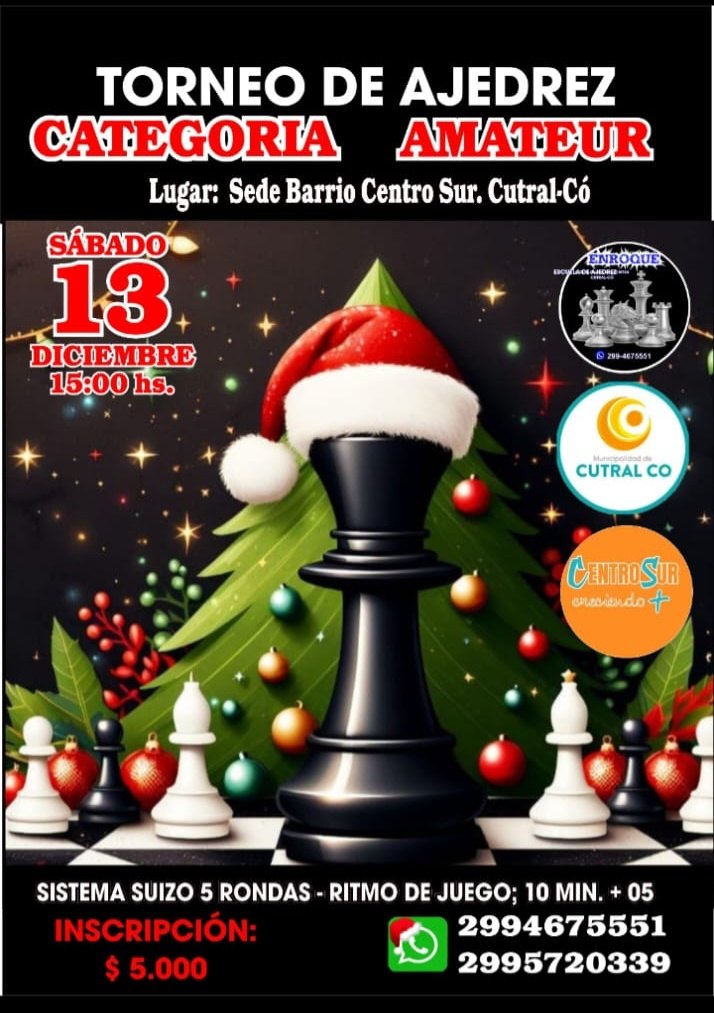 La comunidad ajedrecística de Cutral Co tendrá una nueva cita deportiva este sábado 13 de diciembre, cuando se dispute un Torneo de Ajedrez categoría Amateur en la sede del barrio Centro Sur. La competencia, organizada bajo el sistema suizo, constará de cinco rondas y contará con un ritmo de juego de 10 minutos más 5 segundos de incremento por jugada, un formato dinámico que permite partidas ágiles sin perder precisión estratégica.
