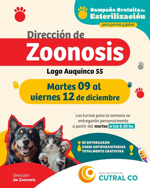 La persona que tenga el turno debe comprometerse para concurrir con el animal. La dirección de Zoonosis está en Lago Auquinco N° 55, en el barrio Parque Este de Cutral Co.