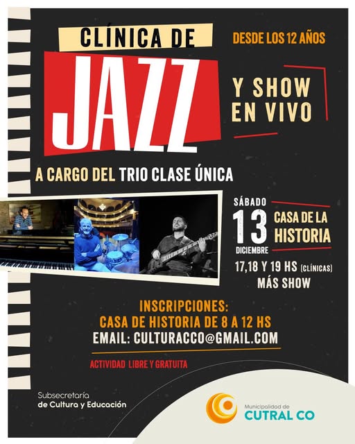 Cultura de Cutral Co anunció una nueva propuesta para este sábado 13 de diciembre, cuando la Casa de Historia será sede de una jornada dedicada íntegramente al jazz, con clínicas formativas y un espectáculo musical en vivo, a cargo del Trío Clase Única.